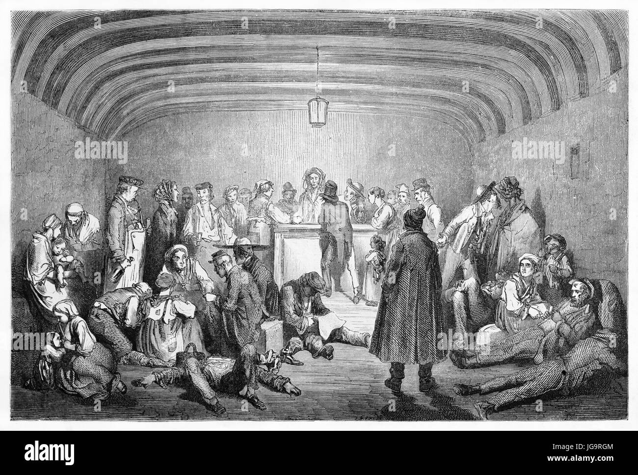 Ilustración antigua de inmigrantes a bordo de un vapor en el río Saint Lawrence. Creado por Doré