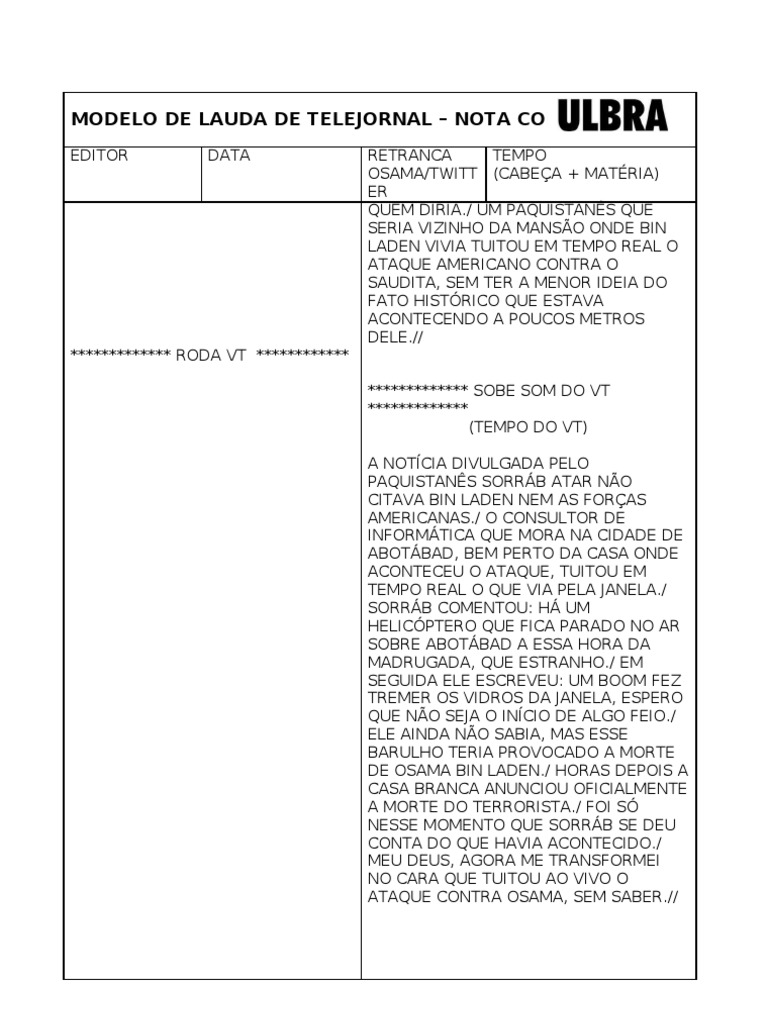 Para aquele professor que insiste em formatação no estilo ABNT mas desconhece a diferença entre lauda e página. Lauda é uma medida para composição gráfica. Na época da composição manual, o diagramador preparava a página do jornal, livro ou outro impresso geralmente dentro de 30 linhas de 70 toques (incluindo espaços e pontuações).